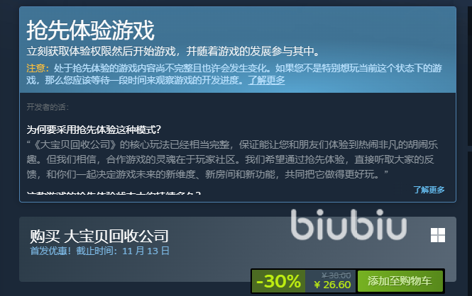目前,大宝贝回收公司已在Steam平台开放购买渠道。原价为38元,现正值限时优惠活动期间,仅需26.6元即可购入游戏本体,性价比极高。此外,玩家还可将该游戏添加至Steam愿望单,便于及时获取后续更新和上线通知,确保不错过任何重要动态。