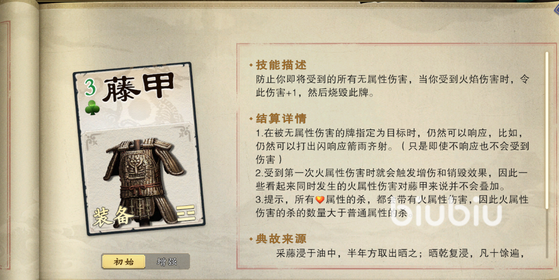 防具主要用于提升生存能力,减少受到的伤害并延长作战时间。八卦盾可通过判定实现伤害抵消或体力恢复,拥有极强的持续作战价值,无论是应对爆发性攻击还是逆转劣势局面都表现出色。藤甲可完全免疫普通【杀】造成的无属性伤害,是抵御常规进攻的有效屏障,但无法抵挡如【火杀】这类附带火焰属性的攻击,因此在对阵以火系技能为主的对手时效果有限,选用时应结合敌方阵容特点进行判断。