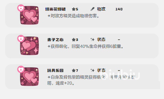奇梦咪的技能体系由普通技能和血脉技能构成,其中血脉技能多达七个,具备多样化的战斗功能。首先是物理攻击类技能【超级糖果】,拥有130的基础威力,命中后可使目标进入“萌化”状态,干扰对手判断,同时还能提升后续部分技能的伤害输出。