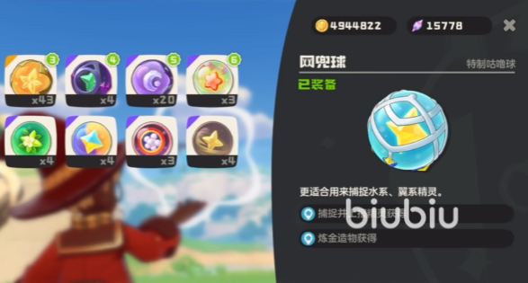 最基础且最容易获得的是普通咕噜球,整体以清新的蓝色为主,球体中央点缀着一颗白色小星,外观简洁明快。新手玩家在刚进入游戏时,可通过炼金台使用常见矿石并消耗少量体力即可合成。由于其制作成本低,适合用于捕获野外等级较低、属性普通的初级宠物,但捕捉成功率有限,面对强力或稀有宠物时效果不佳。