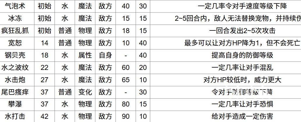 在技能配置方面,可选范围包括气泡术、冰冻、宽恕、钢贝壳、水之波纹、水击炮、尾巴瘙痒、攀瀑以及水打击等。若难以抉择技能组合,推荐使用“宽恕+尾巴瘙痒+攀瀑+水打击”或“水打击+尾巴瘙痒+攀瀑+水击炮”这两套方案。