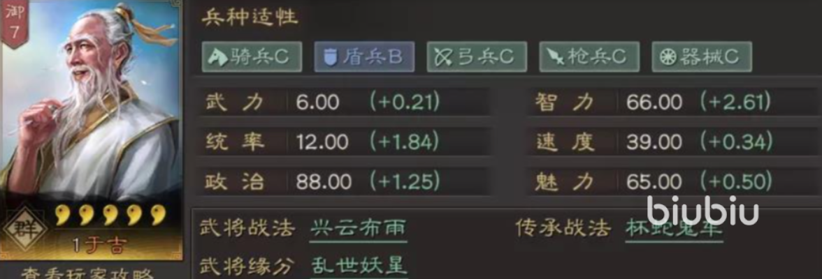 从基础数据来看,于吉的武力值偏低,难以胜任前线输出任务;智力表现尚可,但在面对顶级谋略型武将时仍显不足。真正让他脱颖而出的是高达1.84的统率成长,这一数值保障了他在战场上的生存能力与持续作战稳定性。此外,他还具备30%的“仙人”特性,这意味着他在兵种搭配上几乎没有限制,能够灵活适配骑兵、步兵、弓兵等多种单位,极大提升了阵容构建的自由度。