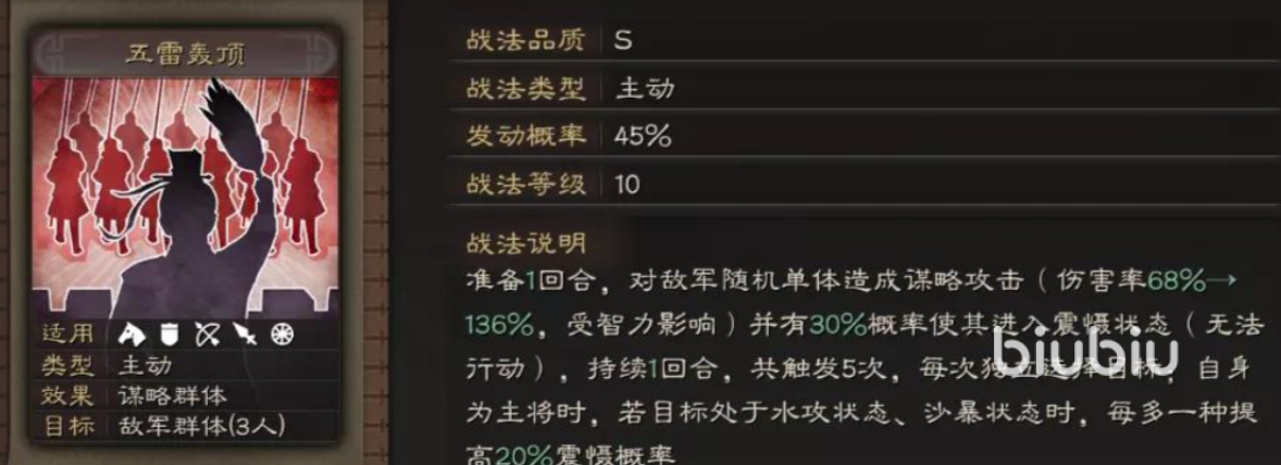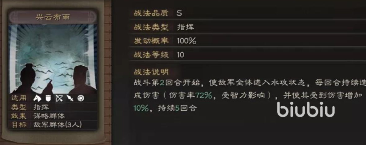 于吉的核心技能“兴云布雨”是他立足战场的关键所在。该战法能对敌方全体施加“水攻”状态,并附加一定量的法术伤害。除了稳定的群体伤害外,更重要的是其附带的控制效果,能有效打乱对手节奏,为己方创造有利输出窗口。当于吉与张角共同出战时,二者可形成雷水联动体系:张角利用雷系战法打出高频伤害,而于吉则维持水攻状态,增强异常状态触发概率,提升整体控场效率与连锁反应覆盖率。