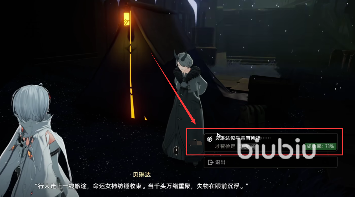 该选项对应技能鉴定难度为65,只要道德值维持在60以上,成功概率可超过70%。通过判定后,能有效说服贝琳达,确保任务后续环节顺畅进行。