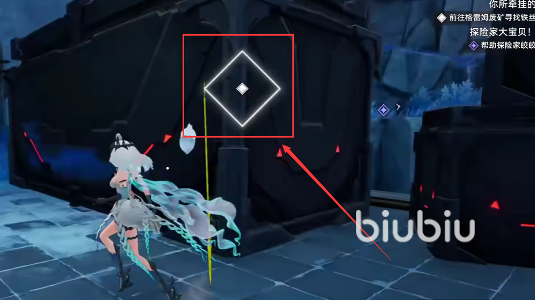 下一步需要传送到格雷姆废矿的底层区域。铁丝的具体位置位于矿洞右侧的废墟地带,靠近一个明显的集装箱。靠近该集装箱时会出现白色提示条,互动后即可拾取铁丝。