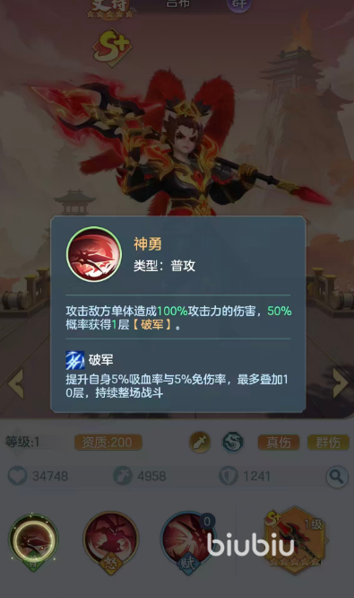 在技能体系方面,吕布的普通攻击除造成等同于自身攻击力100%的伤害外,还有50%概率为自己叠加一层破军状态,通过连续普攻可快速累积层数。其怒气技能“天下无双”则能打出110%攻击力的高额伤害,并基于当前生命值的8%附加额外真实伤害。此外,释放此技能后还能为目标施加两层破军,形成良性循环,加速状态叠加进程。