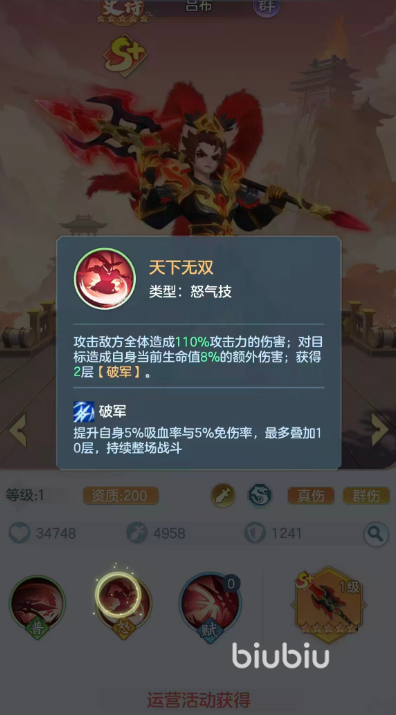 从基础属性来看,吕布的初始品质即为S+,是当前游戏中武力值最高的角色之一。他所佩戴的专属武器“方天画戟”为其提供了高达11万点生命值提升和超过1万点的攻击力加成。同时,该武器还赋予其1%的生命、攻击与防御三项基础属性增益,进一步强化了他在战场上的生存与输出能力。