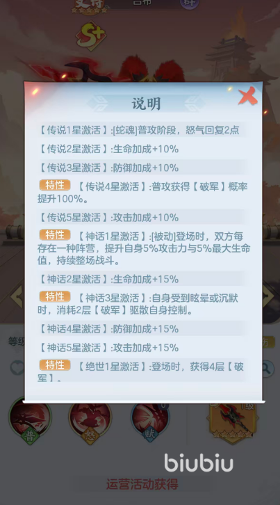 天赋方面,当吕布达到传说等级后,其被动能力将被激活。一星时解锁“蛇魂”效果,每次普攻有几率恢复2点怒气,加快大招释放频率;二星时生命值加成提升10%;三星时防御属性增加10%,均为关键属性的实质性增强。