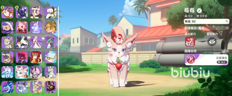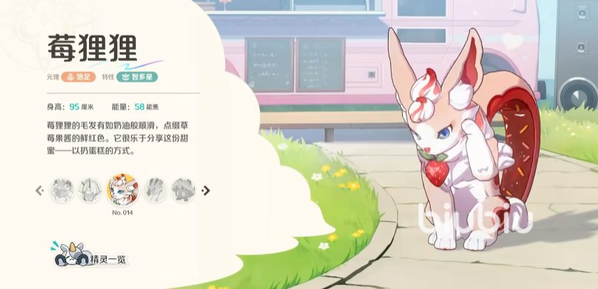 莓狸狸的元理属性为饱足,在游戏初期主打饱足流派的阵容中具有不可替代的地位。其特性为“智多星”,身高设定为95cm,技能释放时伴随着蛋糕投掷类的视觉特效,进一步强化了它甜美活泼的角色定位。不过需要注意的是,该精灵的能量消耗相对较高,达到58能焦,因此在搭配阵容时需合理规划能量分配。