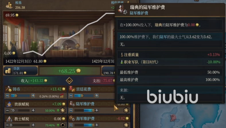 除了赚钱,一个国家运行的支出因素也是要考虑到的,很多建筑,比如教堂,市场以及兵营等,维护是有成本的,这就需要玩家使用政府支付特定商品来维持运营。好在政府仅承担20%的商品成本。这部分成本也是波动的,完全依据当前建筑所在市场的商品价格来决定,贵价商品越多,成本越高,但是高价值的建筑会创造需求,从而提升市场内的资源采集点以及生产建筑的盈利能力。