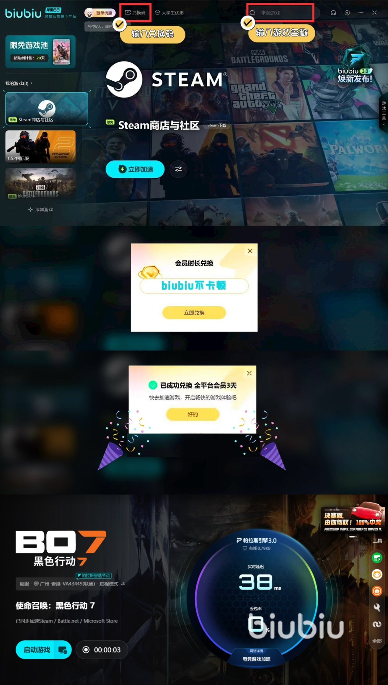 近期的重磅升级,不仅引入了全新的帕拉斯引擎3.0,还邀请职业冠军选手左梓轩参与联合调校,进一步提升了连接的稳定性与响应速度。压缩数据传输路径,有效的降低网络延迟,保证操作即时反馈。新用户首次使用,可以在完成注册登录后得到24小时免费优化时间,轻松体验流畅效果;此外平台也给新老用户们准备了专属的兑换口令,正确输入【biubiu不卡顿】,还能得到额外三天的继续加速时间,让更多用户们无门槛感受高品质网络服务带来的游戏提升。