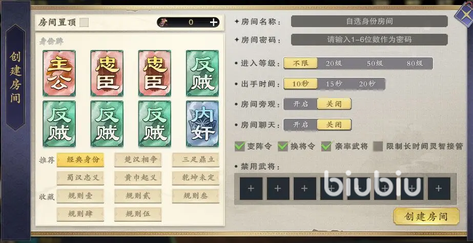 房间玩法最突出的特点在于规则可自定义。房主在创建房间时,能够灵活设置参与人数与身份分配方式,包括手动指定主公、反贼、忠臣或内奸等角色归属,从而实现更具针对性的战术布局。这种机制让每一场对局都充满变数,提升了策略深度与互动性。