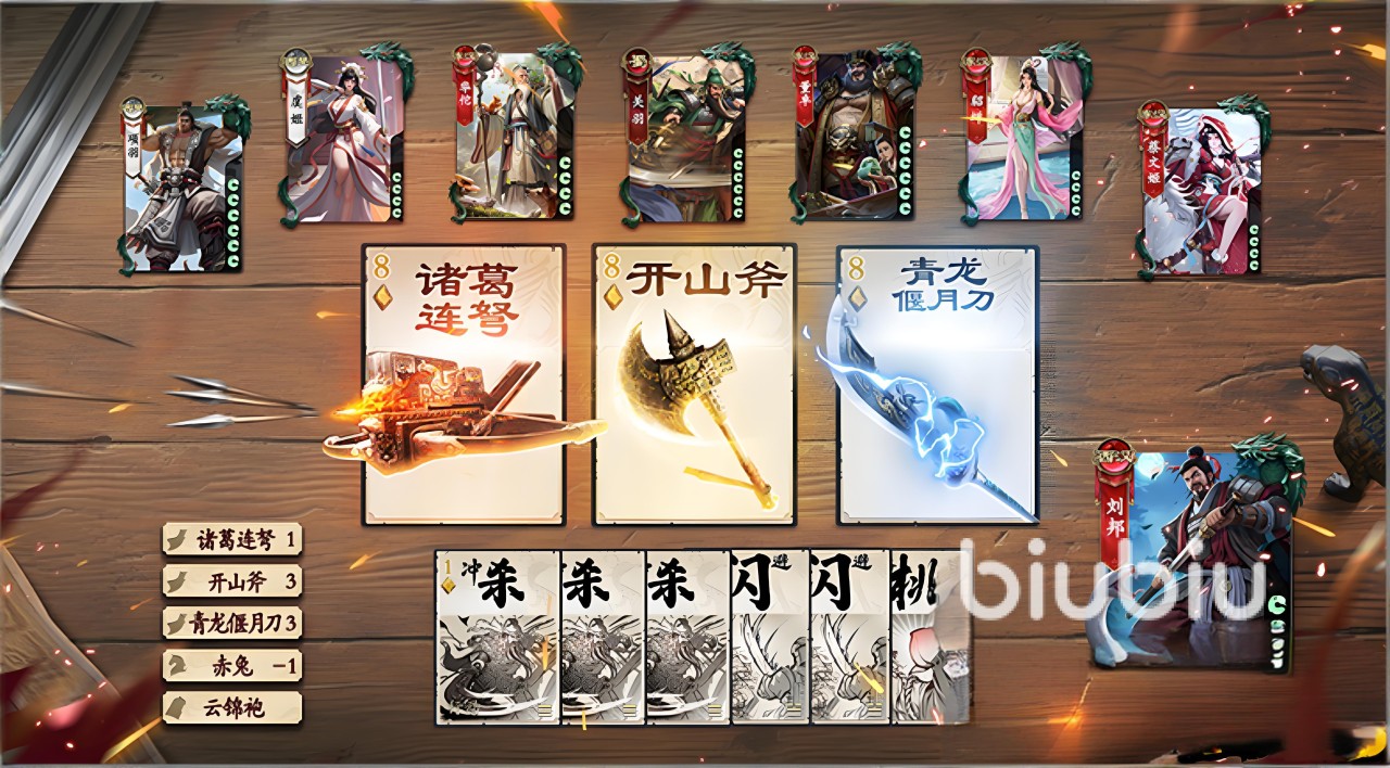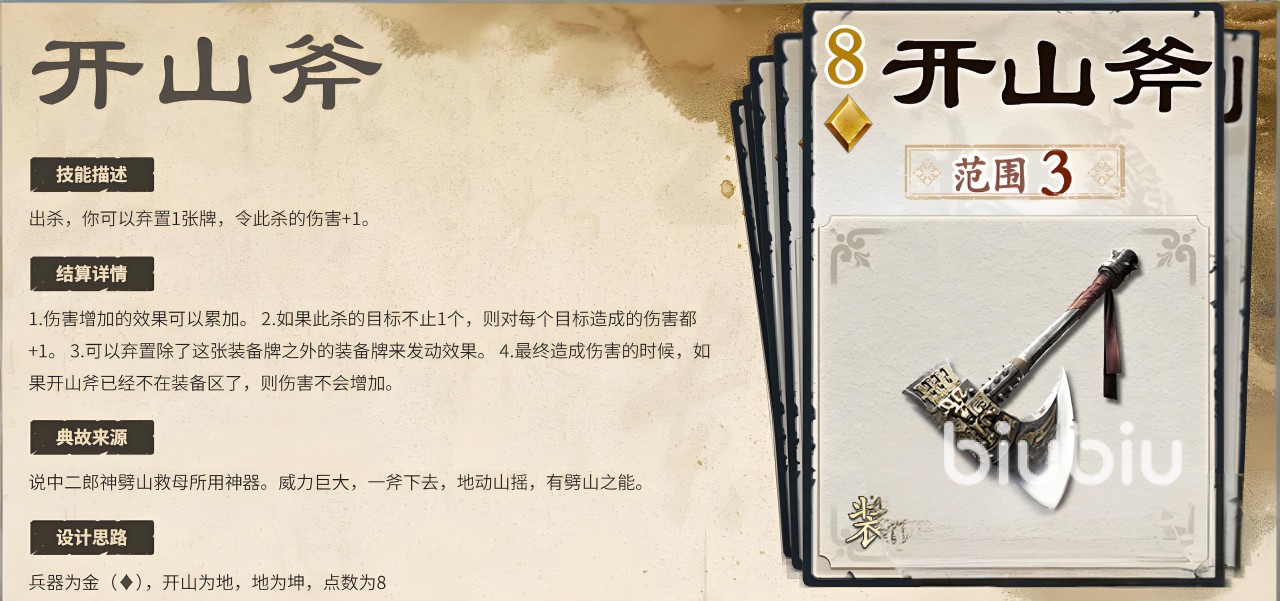 首先介绍的是防御向装备——云锦袍。该装备的基础效果为装备栏上限+2,当装备区已满五件时自动弃置云锦袍,并由系统移除最早进入装备区的那张装备牌,体现出土系“以守代攻、后发制人”的策略逻辑。此外,云锦袍支持与其他防具共存,构建起涵盖物理防护、火属性抗性及闪避能力的三重防御体系。其兼容多种搭配方式的特点,使其既能服务于输出型武将,也能适配需要持续作战能力的角色,尤其适合用于长期对局或核心位武将的配置。另一款关键装备是攻击型武器开山斧,具备扩大攻击范围和提升暴击伤害的基础属性。其专属技能“地裂”允许玩家在使用【杀】时弃置一张手牌,使本次【杀】的伤害+1,且该加成可多次叠加。这一机制赋予了开山斧极强的爆发潜力,能够在群战中迅速压制对手,实现高效清场。