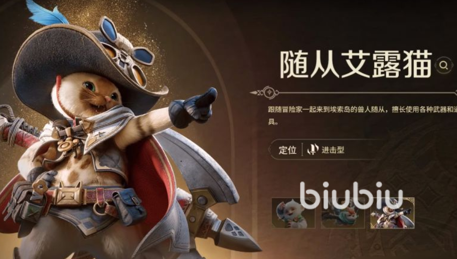 该游戏虽然没有传统意义上的“宠物”称呼,但设有完善的随从体系。当玩家开启相关挑战后,可从三种不同类型的随从角色中进行选择。每位随从都具备独特的战斗定位和技能特性,玩家可根据自身战斗风格挑选合适的搭档,从而显著提升狩猎效率。首先是广受喜爱的艾露猫,这一经典随从能够在战斗中承担近战或远程支援任务,同时有效增强团队整体输出能力,是追求高爆发队伍的理想之选。