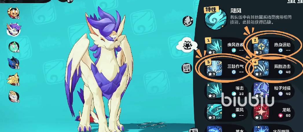 当上述三项技能全部习得后,应按照热身运动 → 三鼓作气 → 乘胜追击的顺序进行学习。完成学习后,查看翼王的特性会发现一个特殊机制:若队伍中存在其他翼系精灵携带相同技能,则该技能可触发“迅捷”效果。因此,在组建热身连击流阵容时,除翼王外,推荐搭配另一只翼系精灵——翼龙,以最大化技能协同。