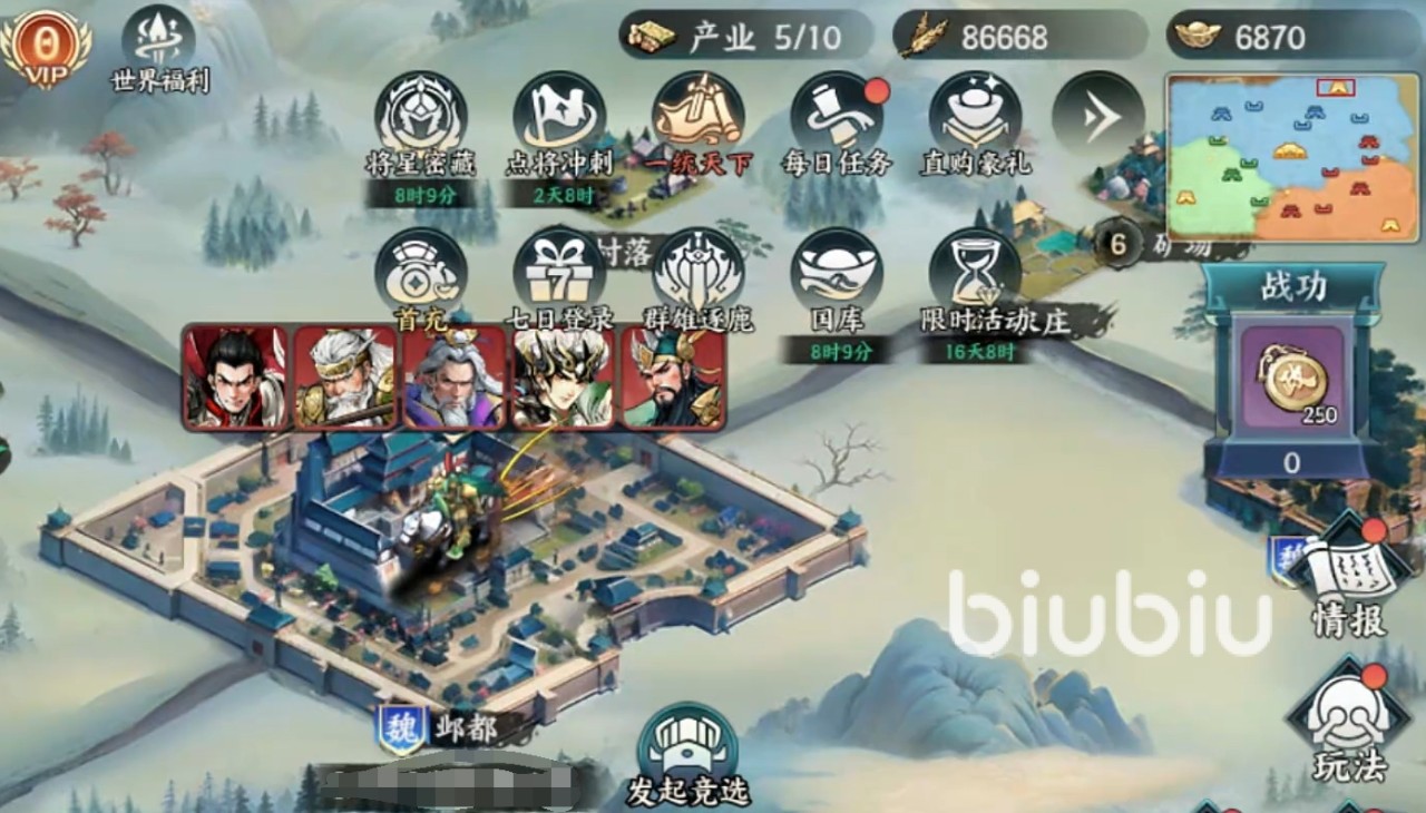 本作以势力经营与武将养成为核心玩法,玩家可通过占领农庄等资源点获取基础物资,支撑城池建设与发展。资源点可随等级提升和科技研发不断强化产出效率,助力玩家加速崛起。武将获取途径多样,既可在点将台使用点将令抽取,也可通过开启战利品宝箱收集武将碎片进行合成,轻松组建理想阵容。重复获得的武将将自动转化为升星材料,用于提升武将星级,显著增强整体战斗力。