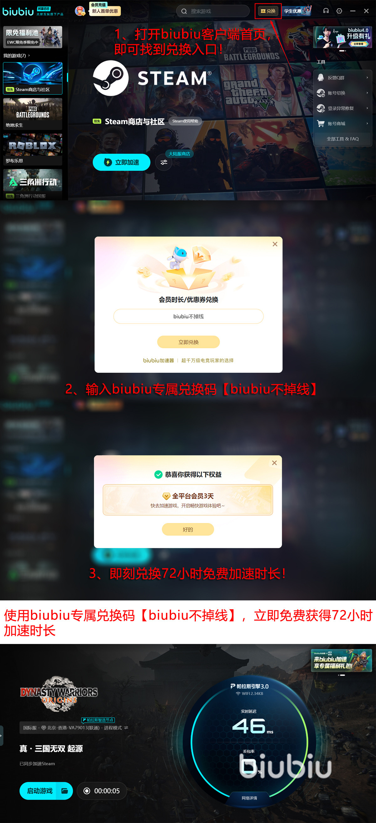 biubiu还是个大方的加速器,给用户各种福利,其中新人得到的最多。先去注册会拥有新用户专属的24小时服务时间享受,首页上边栏还能使用密钥【biubiu不掉线】,所有用户都能换到免费的72小时,也就是可享受到的最高时长其实有96小时。
