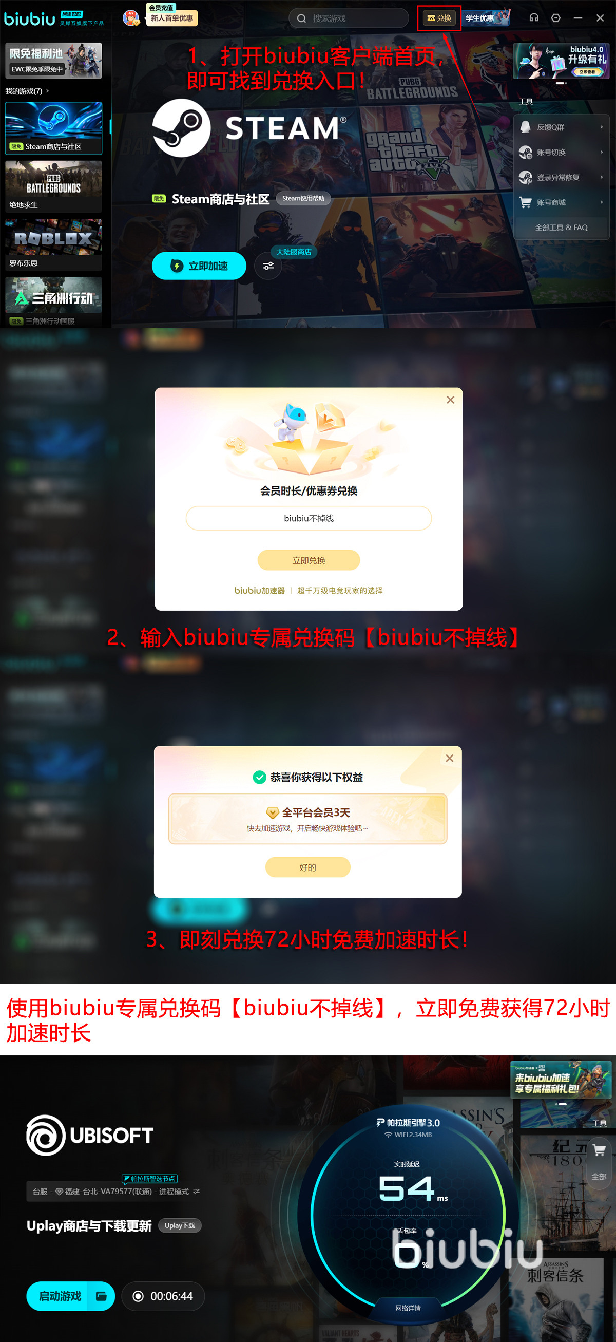 精彩游戏不被网络拖累,biubiu加速器给新用户送礼,马上注册账号就能得到24小时免费尊享时长,这只是开始,输入激活口令【biubiu不掉线】,还能先到先得72小时,加上口令福利,新人一下就可获得总共96小时的畅玩时间。