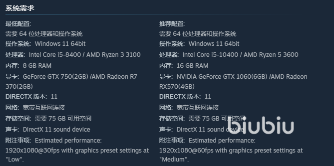 游戏的主要运行依靠强大的硬件基础,最低配系统必须是Win11 64bit版本,搭配i5入门级的处理器,不过比较旧款设备可能会有性能瓶颈的情况出现。而8GB属于硬性要求,在处理后台多任务时会更有帮助。显卡750,负责渲染画面,对于720p分辨率来说足够了,但是高画质模式下帧率不太稳定,玩家要做好优化设置准备。 要DirectX11版本的支持,这样提升了图形渲染的效率和兼容性,防止老驱动出现崩溃的情况,存储空间设定成75GB可用的空间,玩家得保证自己的硬盘或者SSD留出足够的容量来存放大型游戏文件还有更新以及DLC。