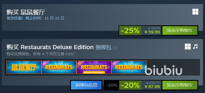 鼠鼠餐厅发售价格已经分享给大家了,当前购入是比较划算的,除了单纯的游戏本体之外,还提供了一些捆绑包,如果小伙伴们发现有的捆绑包当中的作品也是自己想玩的,那么也可以考虑购买捆绑包。