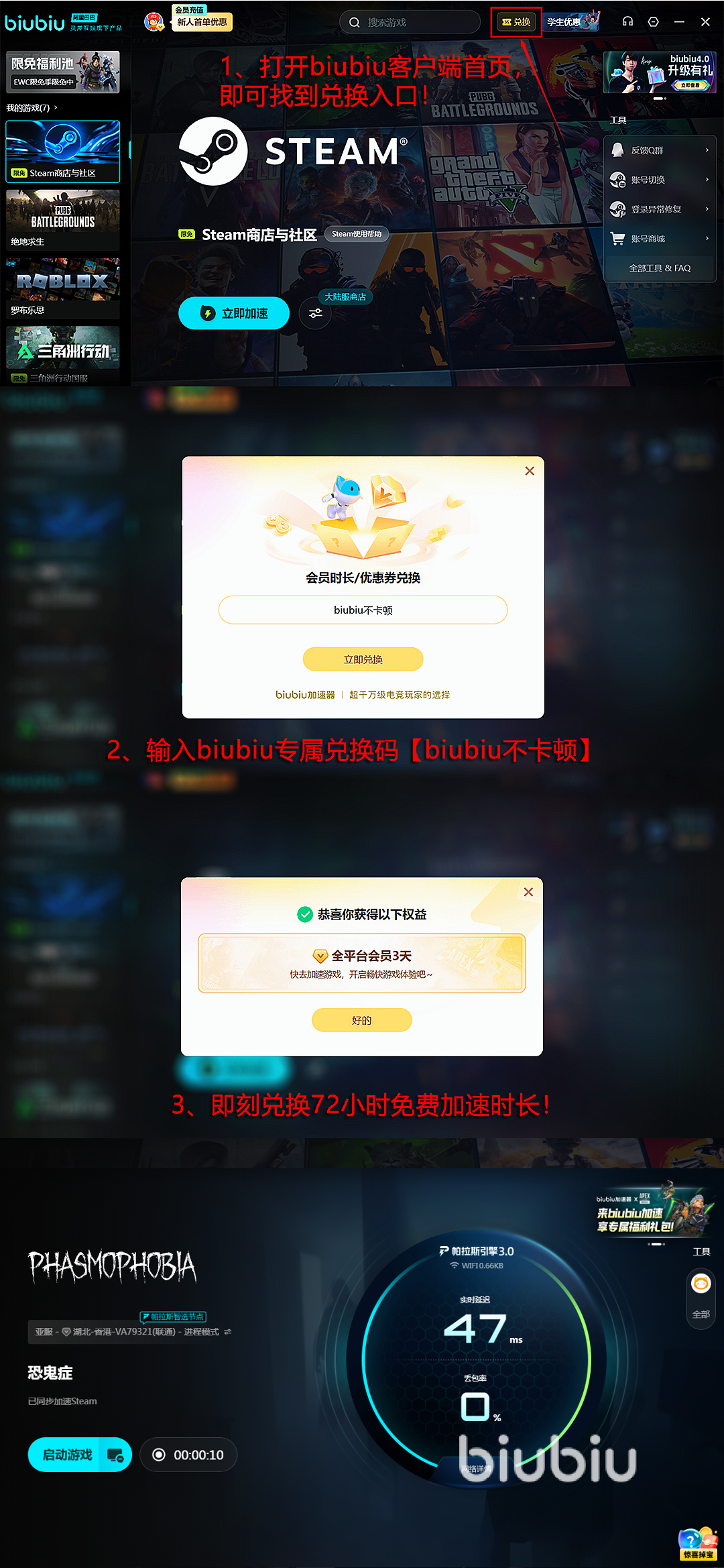 还有就是有些玩家喜欢跟外国友人联机,那么biubiu还是可以支持多个渠道服,覆盖主流国际服节点,让玩家们在国际服游玩的时候不卡顿,并且新人在注册后便获24小时免费加速,轻松解决各类游玩难题,同时新老用户使用兑换码【biubiu不卡顿】可获3天免费的使用权哦。