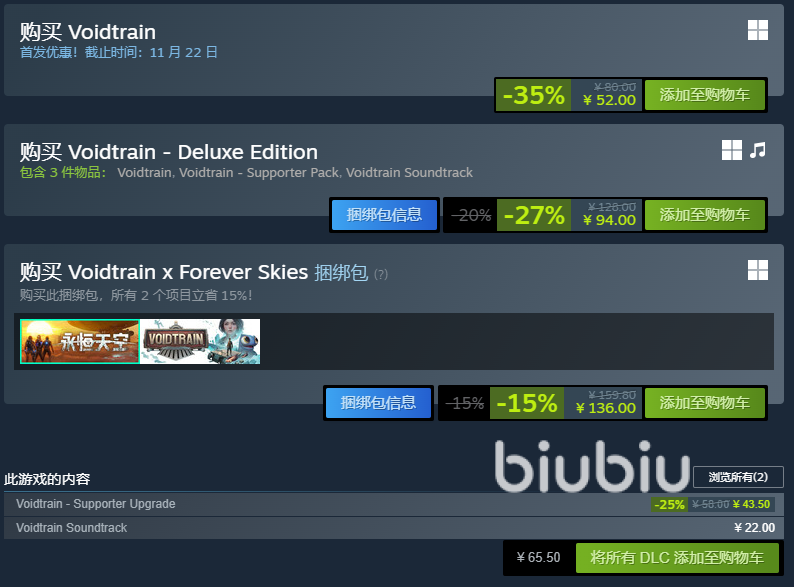以上就是小编准备的虚空列车发售价格多少钱所有内容,目前首发优惠已经过去几天,其持续时间到11月22日,所以想要购买的小伙伴要抓紧了,同时为了提高游戏下载速度和玩游戏时的网络稳定,大家还需要提前安装好biubiu,因为biubiu也能给游戏下载提供加速服务。