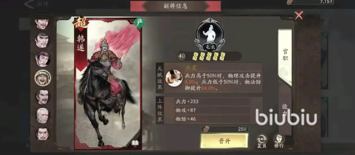 韩遂:拥有出色的机动性增益效果,当移动步数达到三格时,自动获得物理防御加成,特别适用于对抗骑兵单位。其反击机制需在敌方主动攻击时触发,成功反制后可对进攻者造成15%固定伤害,属于典型的以守待攻型副将,适合布防类战术布局。