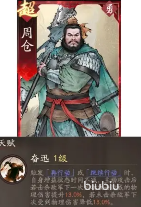 周仓:专精于再行动机制的强力副将,与关羽等具备高频率行动能力的主将配合时效果显著。其技能可在满足条件时赋予主将额外行动机会,且无时间限制。若主动攻击成功击杀目标,则提升13%伤害输出;若未击杀,则提供13%物理减伤,攻守转换极为灵活。