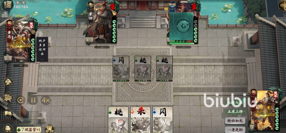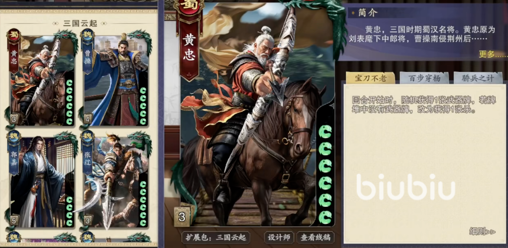 第三个技能“骄兵之计”则赋予了黄忠一定的反制与资源积累能力。当黄忠成为其他角色使用【杀】的目标时,他可在响应阶段做出选择:一是不摸牌并立即回敬一张【杀】;二是放弃反击机会,使下一次因“骄兵之计”触发的摸牌数+1,增益持续至下一回合开始。