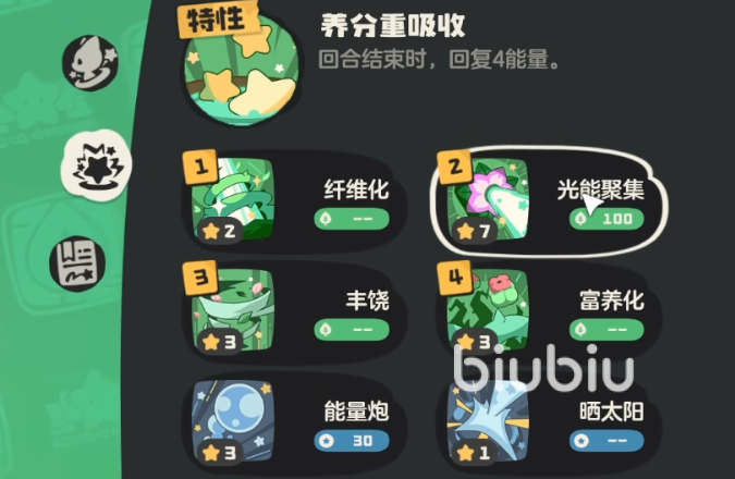 技能配置方面,必须携带纤维化、丰饶和光能聚合这三个关键技能,并额外配备富养化作为支援手段。若己方被控场,该技能可为后续出场精灵提供能量支持。若未获得首领形态,可用叶绿光束替代,配合特性每回合结束回复4点能量,进入首领化后提升至7点。只要所用技能消耗不超过7点能量,即可形成循环不断行动的永动链。