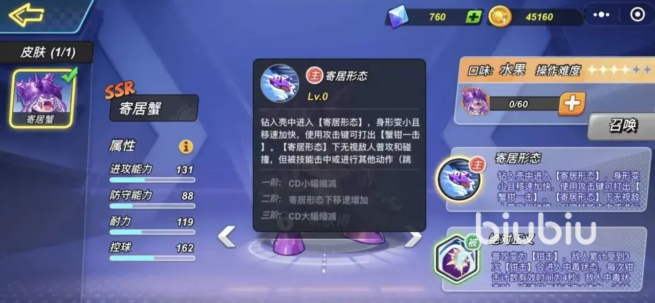 寄居蟹是一位以机动性和持续伤害见长的灵活型SSR角色。其主动技能可进入“寄居形态”,在此状态下大幅提升移动速度,并免疫所有普通攻击,期间点击攻击键即可对上方敌人发动强力夹击,实现快速位移与突袭打击的结合。