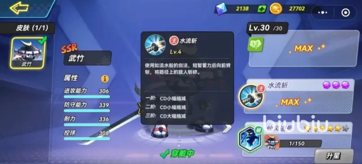 该角色拥有三段式普攻,第三段附带击倒效果,并释放一次小范围突刺攻击,造成额外伤害。其主动技能“水流斩”以迅捷剑技为特色,可将对手击倒在地,若对方持球,则会强制掉落篮球,为己方创造抢断反击的机会,兼具控制与得分双重价值。