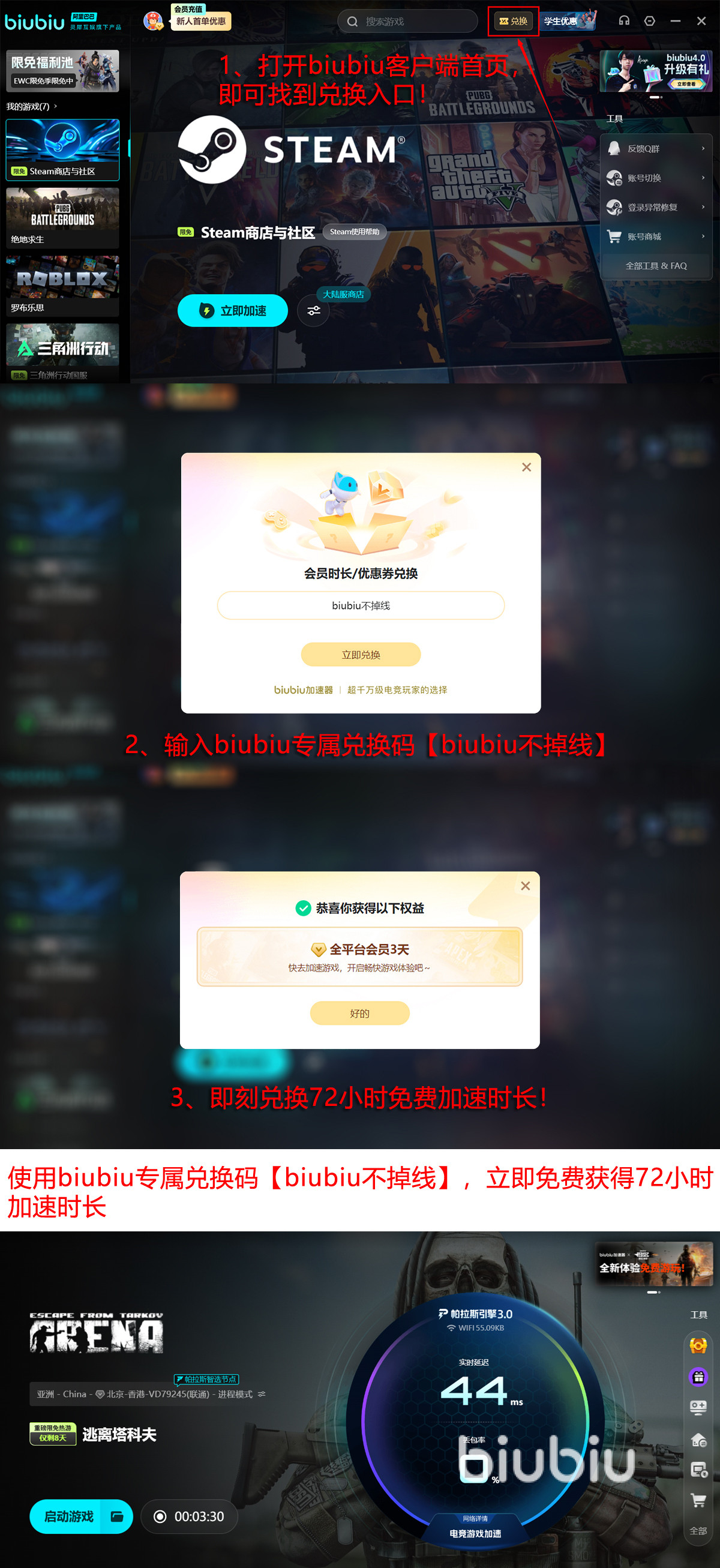 还有个好消息分享给大家,就是biubiu给出来很多的免费福利,大家可以尽情畅享。现在的新人注册后,马上就能得到免费的24小时服务时间,如果还知道兑换码是【biubiu不掉线】,其实还可以得到额外的72小时加速时间用,综合之后给出来的新人免费福利就有96小时了。