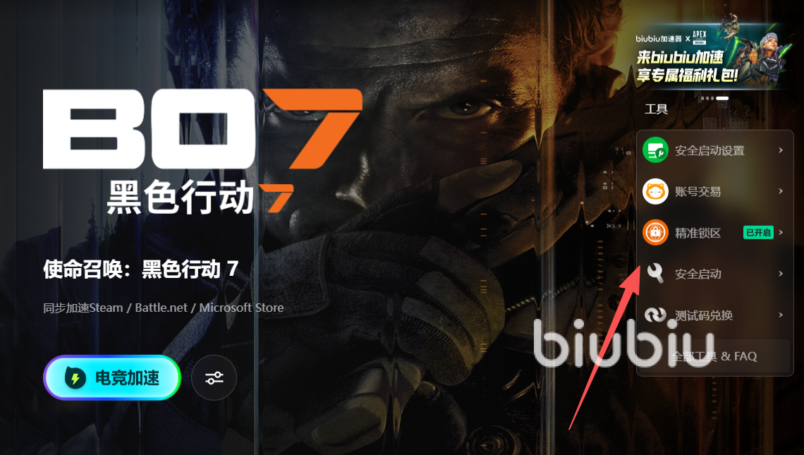 但仅仅依靠语言切换还是不够的,网络问题也有可能造成配音异常,这时候就要借助外部工具biubiu加速器。打开COD22前先开启biubiu加速器,在搜索框里输入“COD22”,点击加速之后能改善电脑本地网络环境,自动分配低延迟节点,从而解决服务器连接中断、延迟卡顿等造成的配音设置不正常的问题,让游戏顺畅运行的同时还能避免网络波动影响音频流同步性,保持战斗中的沉浸感。biubiu加速器自带超强安全启动检测功能,一键即可解决问题,点开加速界面里的“工具箱”选项,选择安全启动工具后执行扫描,系统就会自行检测并修复,避免引发服务器连接断开或者配音设置出错的情况。
