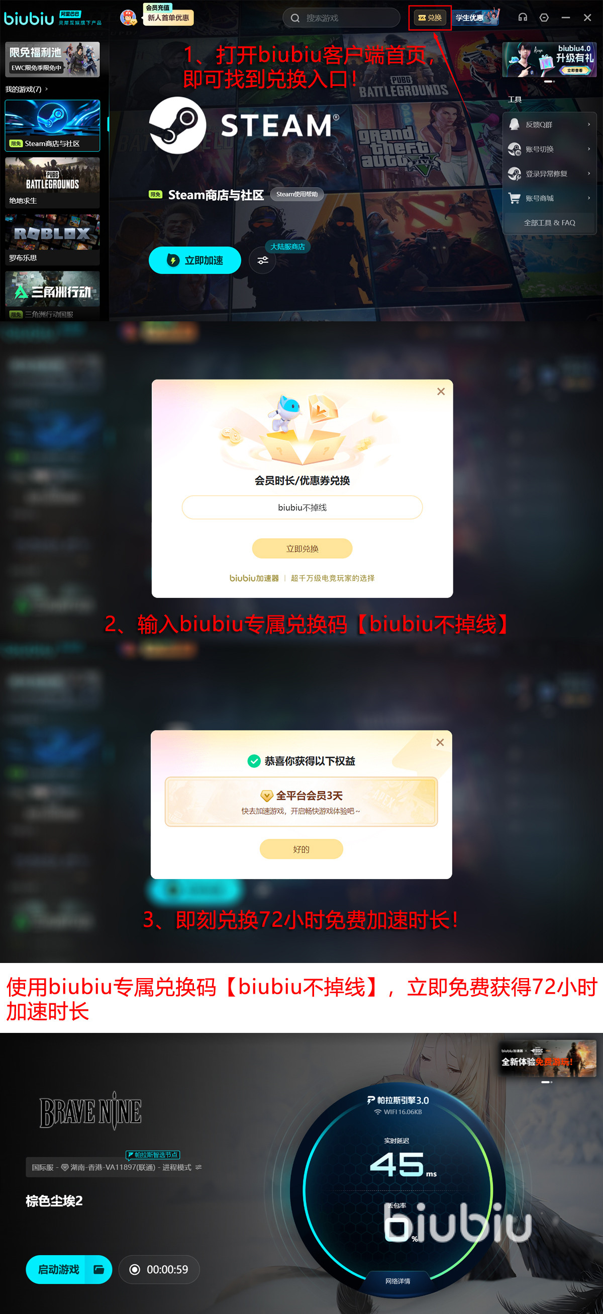 该拿的福利肯定不能少,现在新用户注册biubiu加速器账号就能立刻享受到专属的服务礼遇24小时,并且还有独家福利口令【biubiu不掉线】输入之后还可以再次领取豪华加速时长72小时,双倍福利叠加在一起总共有96个小时的免费加速服务送给新玩家。