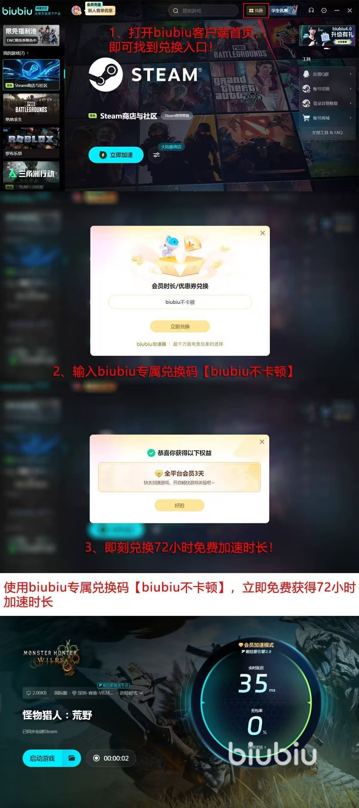 实际测试中,玩家普遍反馈操作响应更及时,组队联机更顺畅,大幅降低了因网络波动导致的技能延迟或掉线问题。同时该加速工具还给初次体验的新人提供了很多的福利,比如第一次的尝试可以享受到24h的免费加速时间,此外平台的所有用户,都能够通过兑换页面,正确输入【biubiu不卡顿】直接兑换到三天的继续加速时间。后续如果使用体验感不错的话,还可以尝试会员充值,多个选项都提供了折扣福利,同时学生群体还能享受学信网兑换码专属折扣。
