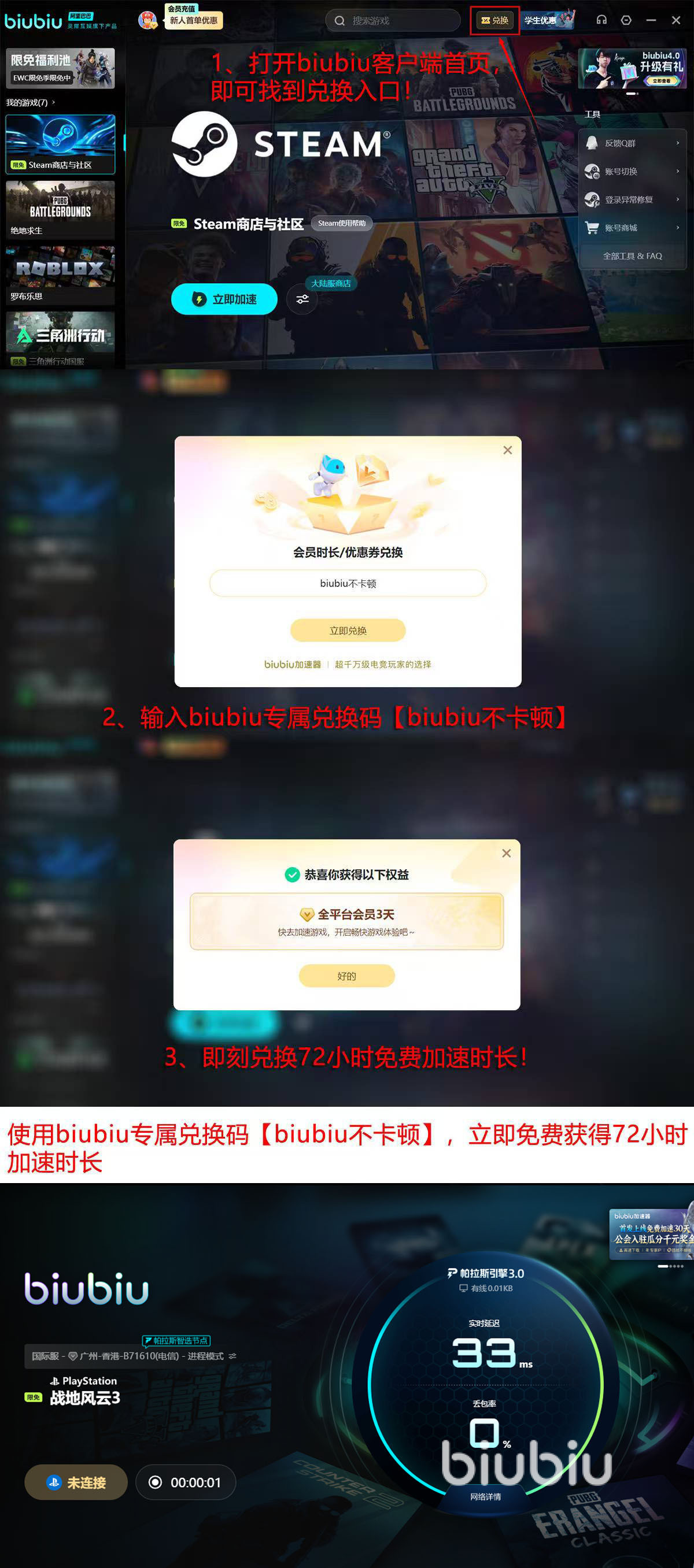 经过biubiu加速器提速和优化后的网络,无论是不是国际服游戏,都能得到极大地提升,并且整体的流畅度也能得到保障,如果想要体验加速效果,biubiu还开展的无成本的体验活动,之前如果没有注册过账号,现在注册后就能立刻得到24小时免费加速时长,同时还能参与老会员才可参与的口令福利领取活动,即用口令【biubiu不卡顿】在首页上直接兑换72小时的加速福利,新人用户实际能领取到96小时福利,而且在所有福利时间内,整个平台上的所有游戏都可以加速。