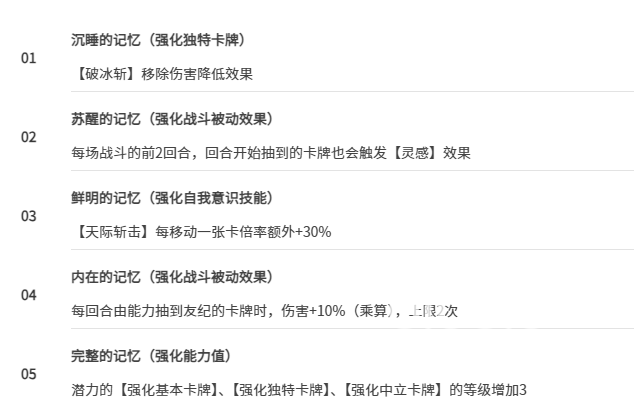 四命效果要求每回合抽到卡牌才能叠加伤害,最多两次,每次提升10%。实战中稳定触发存在一定难度。其唯一优势在于成型后可通过群体攻击规避部分鬼图机制。培养路径较为清晰,选择“沉睡的记忆”可移除破冰斩的负面效果并降低伤害衰减;“苏醒的记忆”则能使前两回合抽取的卡牌正常触发灵感,从而增强天际斩击的实际输出。对于零命或低命玩家而言,难以充分发挥其完整性能。