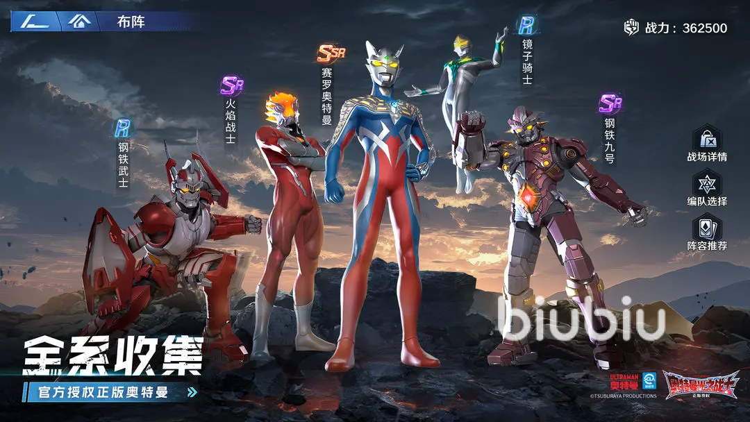 角色获取主要依赖抽卡系统,同时可通过完成任务或参与限时活动获得稀有英雄。其中抽卡为最主要途径。游戏中角色划分为“力量、速度、技巧”三大属性,彼此之间存在克制关系,增强策略深度。每位奥特曼拥有专属技能体系,并配备独特的终结动画演出。