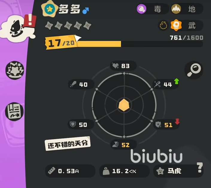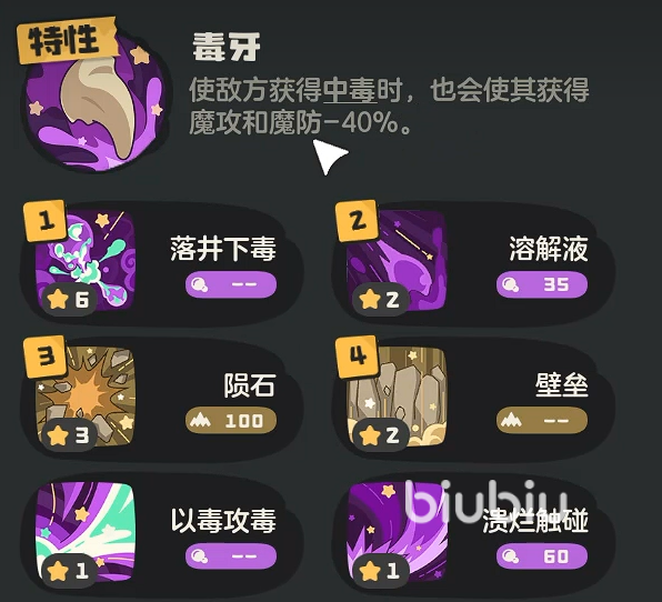 多多的核心特性为“毒牙”,效果是在成功使敌人陷入中毒状态后,额外降低目标的魔攻与魔防。这一机制使其在对抗依赖法术输出的精灵时具备更强的压制力。由于中毒状态较易触发,因此该特性的实际覆盖率较高,实战表现稳定。