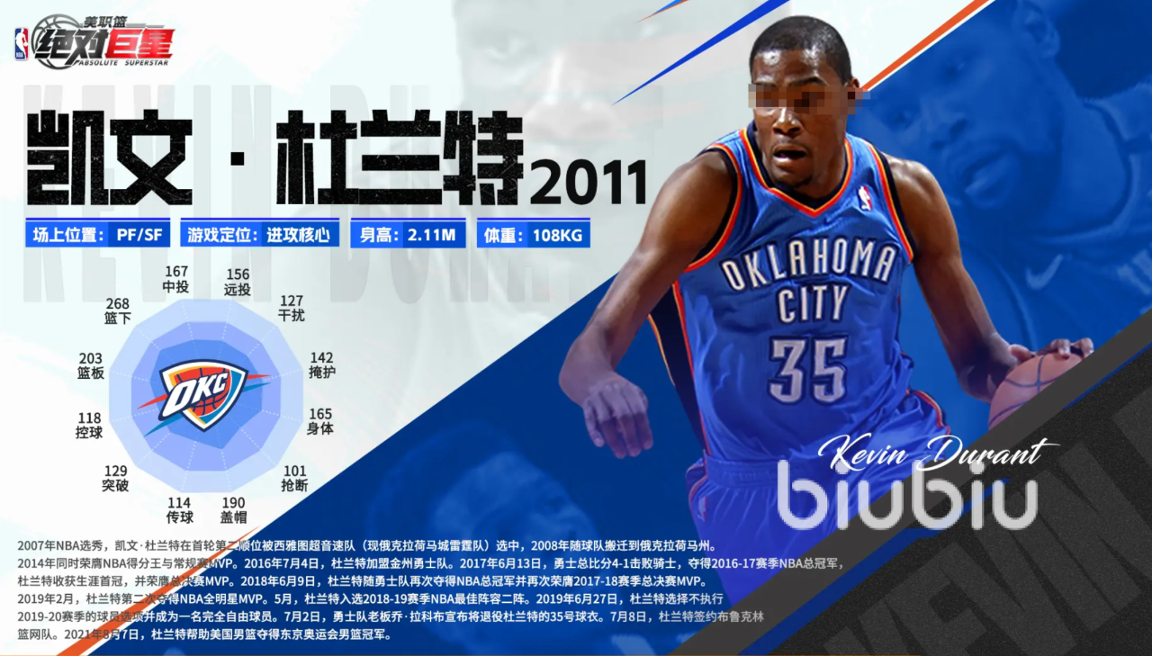 凯文·杜兰特:以超强得分能力和卓越臂展著称,他在攻防两端均展现出统治级表现。具备精准的中远距离投篮技术,擅长单打突破,拥有“死神投射”这一高爆发输出技能,能够在关键时刻撕裂对手防线。作为T0级别的得分手,其综合能力在游戏中稳居前列。
