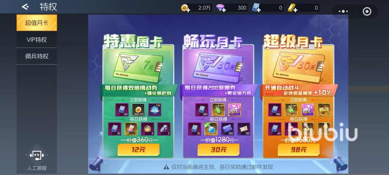 进入游戏后,点击界面左上角即可进入特权中心。当前特权体系主要由三大部分构成:超值月卡、vip特权以及佣兵特权。首先来看月卡类特权,共分为三种类型——特惠周卡、畅玩月卡和超级月卡。激活特惠周卡后,每日可领取双倍挑战券及强化保护剂;购买畅玩月卡则能每天获得200深渊卷和黄金体力药;而解锁超级月卡后,不仅能启用自动战斗功能,还能使史诗装备掉落概率提升10%。