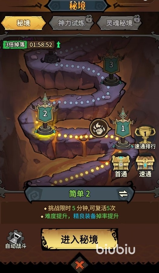 核心玩法围绕副本挑战展开,设有多个难度层级,需逐级通关解锁后续内容。随着难度提升,复活次数减少,挑战时限也更为紧张,但相应的奖励更加丰厚——包括更高的经验值和更高品质的装备掉落。每个关卡设有首通奖励与速刷奖励,前者只需完成挑战即可获得,后者则要求在规定时间内快速通关才能领取。