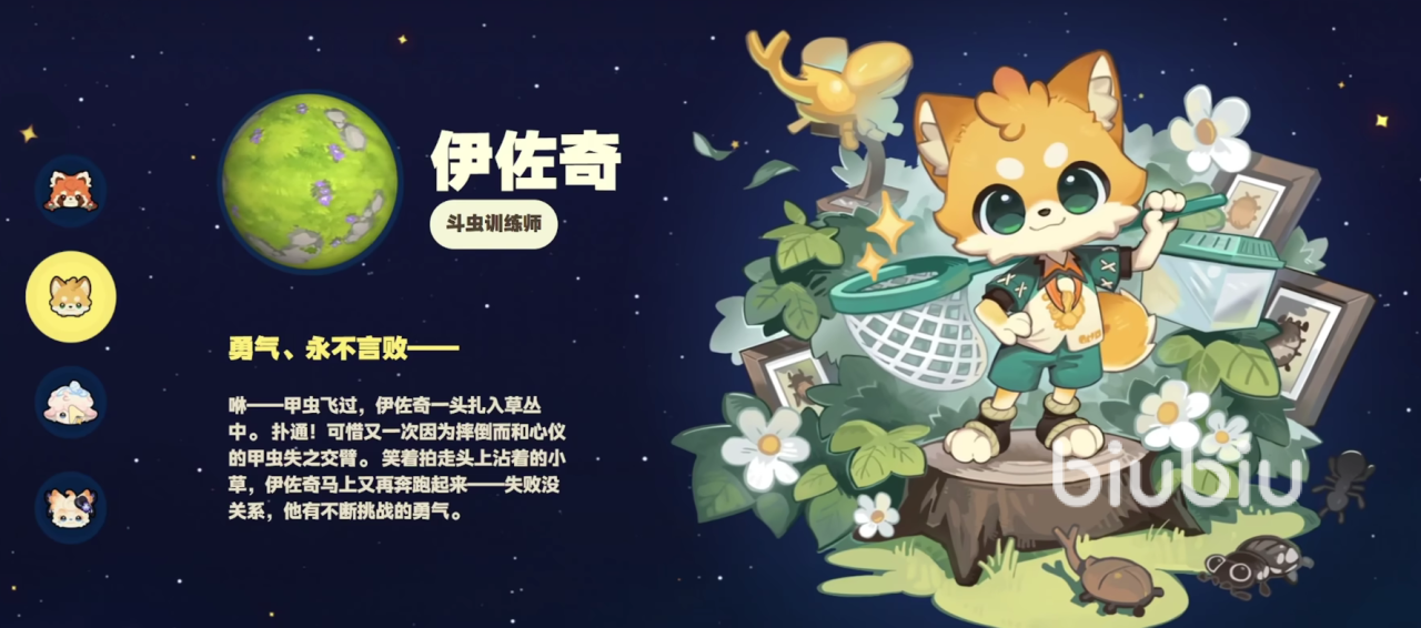 第二位角色伊佐奇同样以狐狸为设计原型,外观为浅黄色毛发,职业为斗虫训练师。他性格乐观积极,擅长使用捕虫网捕捉稀有昆虫,同时能在探险途中帮助驱赶有害虫类,给予玩家勇气与支持。清新的视觉风格使其成为冒险旅程中的理想同伴。