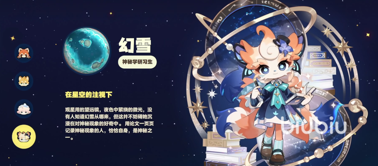 最后一位角色幻雪,其原型为九尾狐,身份为神秘学研习生。她常在夜晚观测星空,研究宇宙奥秘,与游戏中的星际背景紧密相连。作为解答未知现象的引导者,她将在玩家遇到疑问时提供线索与指引,扮演类似导师的角色,增强探索过程的沉浸感。