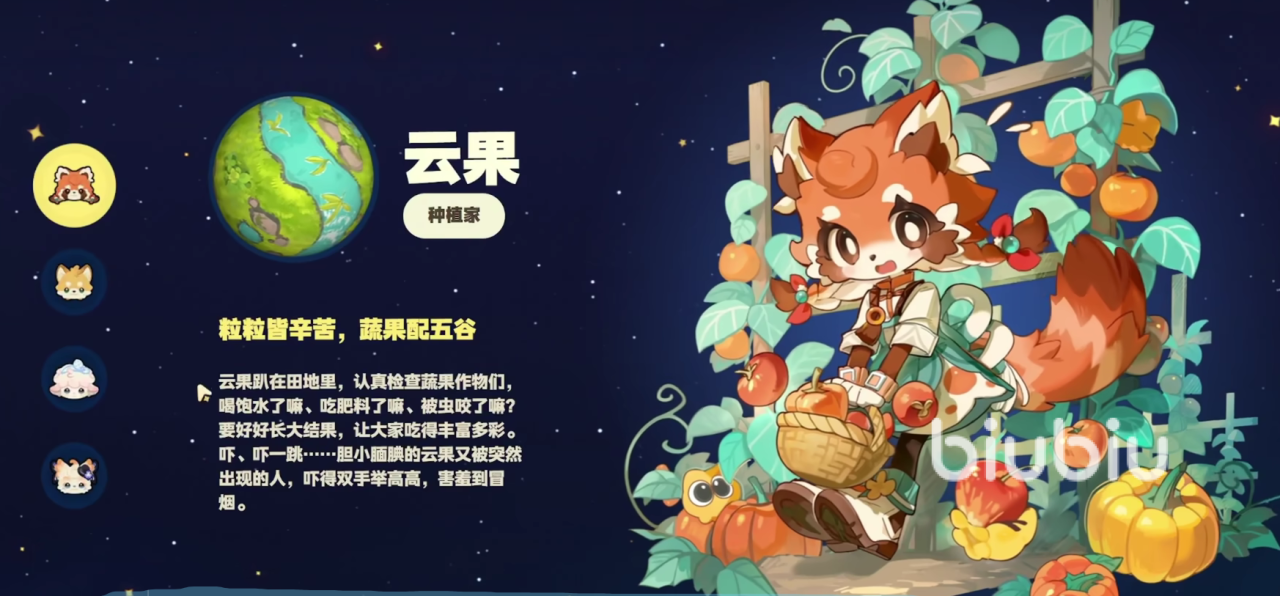 第一位角色名为云果,原型是一只火红色的小狐狸,职业定位为种植专家。性格内向害羞,但在耕作方面极具天赋。在游戏中,他能协助玩家高效种植各类农作物,并负责照看田地,提升作物产量与收益,是经营农场时不可或缺的帮手。