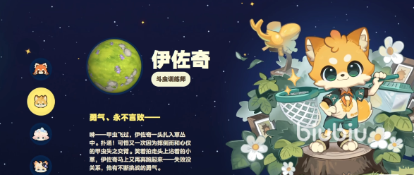 伊佐奇:这位角色是一位充满活力的斗虫训练师,拥有积极乐观的性格和不屈不挠的冒险精神。他坚信坚持到底才是通往成功的唯一路径,在捕捉稀有甲虫方面展现出极高的热情与专业能力。外观上以浅黄色狐狸形象示人,常穿着蓝绿色运动装,整体风格洋溢着青春气息,深受许多玩家喜爱。