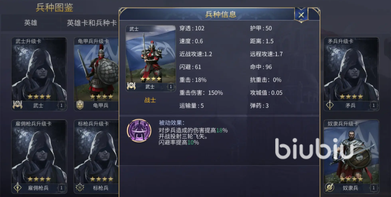 武士是合区前最具战斗力的步兵单位之一,其被动技能可使对步兵造成的伤害提高18%。战斗开始阶段能投掷三轮飞矢,同时自身闪避率增加10%,在前期对抗步兵阵容时优势显著。