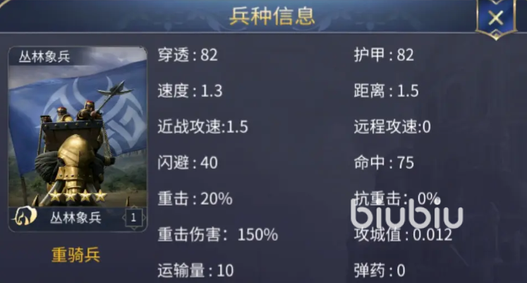 丛林象兵被誉为最强重骑兵单位,被动使其对步兵伤害提升6%,并减少8%所受全部伤害。在冲锋过程中可穿透目标,造成高达220%的爆发伤害,适合用于冲散敌方阵型,是战场上的核心突击力量。