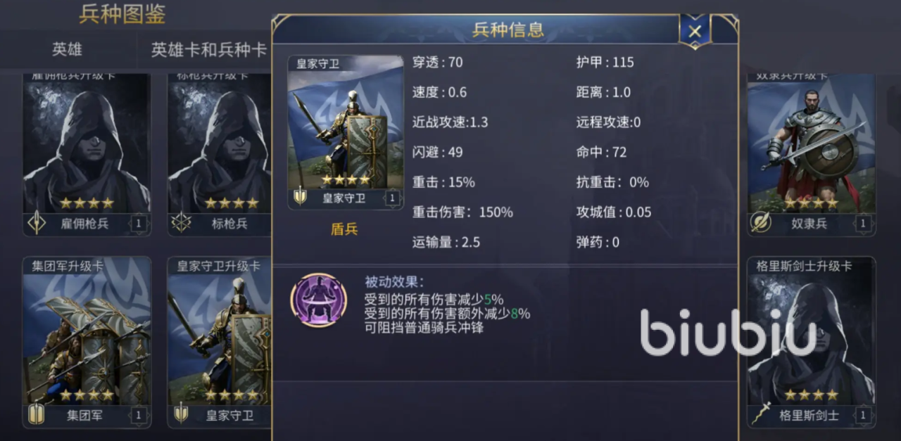 作为综合性能最优的盾兵之一,皇家守卫的被动可在受到攻击时减少5%伤害,并额外降低8%所受伤害。不仅能有效抵御普通骑兵的冲击,还在团队前排承担重要防御职责,适合用于构建稳固防线。